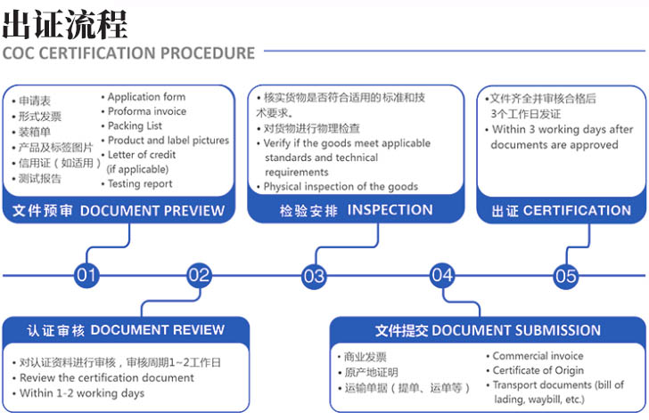 目前博茨瓦納COC認證我們遇到的只有一種操作模式,那就是一次性COC認證模式。這種模式需要申請人聯系所在國的博茨瓦納COC認證機構,然后提交填寫好的認證申請書(RFC)和產品測試報告、本批貨物的商業發票、裝箱單,一致性聲明等文件向PNT提出申請,PNT機構收到資料后先對資料進行審核,如果資料不符合要求,會指出哪里不合格,然后要申請人進行修改,直到合格為止,在資料審核通過后,博茨瓦納COC認證機構安排人員對出口商的貨物進行現場驗貨,確認其是否滿足博茨瓦納標準和博茨瓦納技術規范的要求,如果有必要,將在現場抽取樣品進行測試,如果測試結果合格,將根據進口商提供的貨物最終頒發CoC證書(對于航空運輸,允許根據形式發票頒發證書). 如果抽樣測試不合格,將不予簽發COC證書。